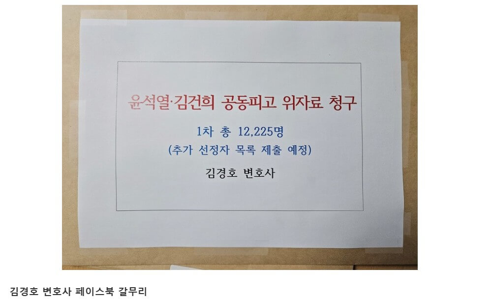 법률사무소 호인의 김경호 변호사는 18일 서울중앙지방법원에 소장을 제출했다. 이번 소송에는 1만2천여 명이 참여했으며, 원고 측은 윤 전 대통령과 김건희 씨를 상대로 각각 1인당 10만 원의 위자료를 청구했다. 김 변호사는 “윤석열 전 대통령의 계엄 선포는 국민 기본권을 침해한 불법행위로 민사 책임이 따른다”며 “김건희 씨 역시 내란 공범들과 소통하고 범행 동기에 깊이 관여했기 때문에 공동피고로 책임을 져야 한다”고 강조했다.