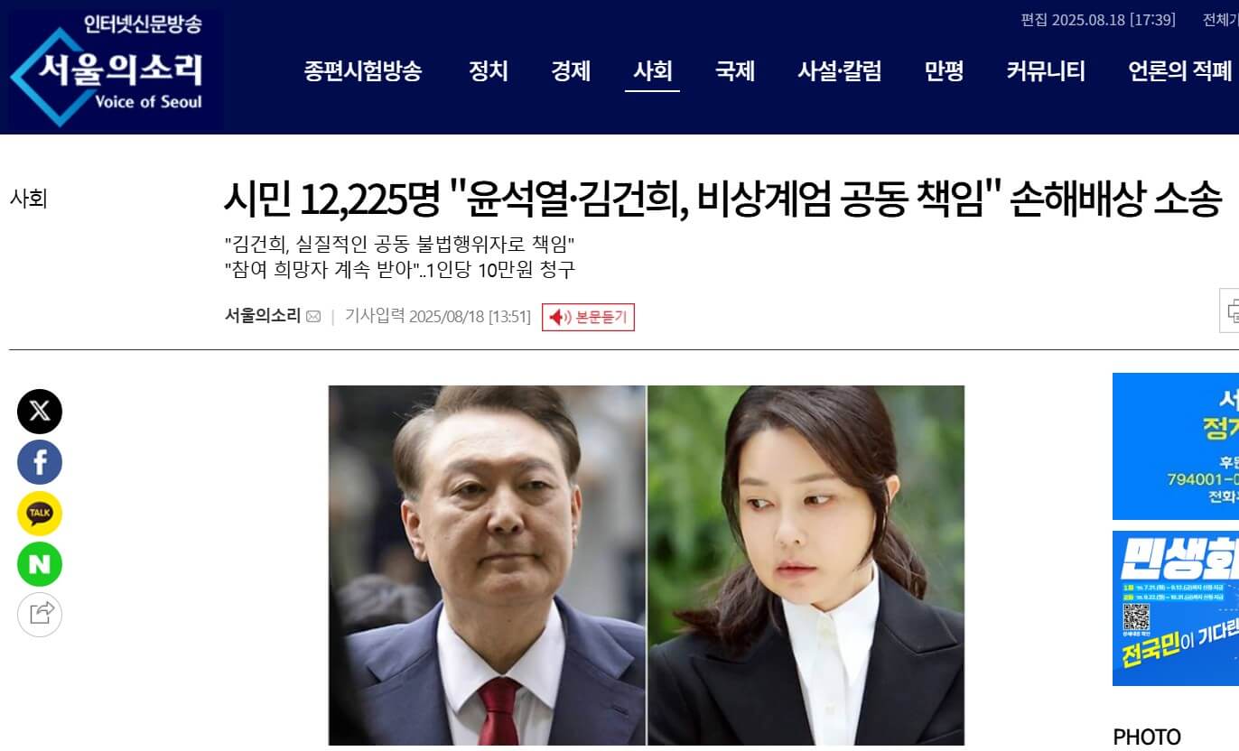 윤석열 전 대통령과 부인 김건희 씨를 상대로 한 대규모 계엄 손해배상 소송이 제기됐다. 지난해 12월 선포된 비상계엄으로 정신적 피해를 입었다는 이유로 시민 1만여 명이 참여했으며, 이번 소송은 윤 전 대통령 부부에게 공동 책임을 묻는 첫 사례다.