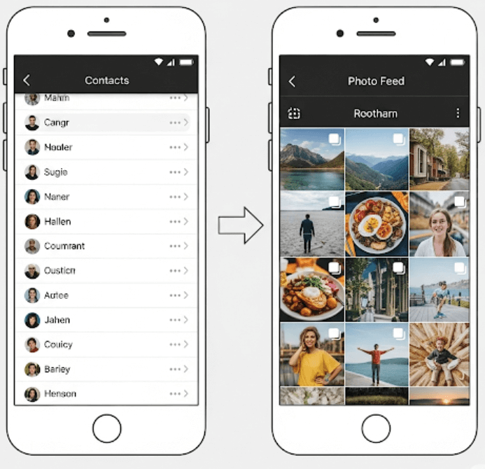 현재 카카오톡의 친구 탭은 이름순으로 정렬된 목록 형태입니다. 하지만 개편 후에는 친구들의 활동이 사진과 영상 피드로 표시되어 인스타그램과 유사한 경험을 제공합니다. 예를 들어 친구가 프로필을 변경하거나 일상을 공유하면, 해당 내용이 피드 화면에서 자연스럽게 노출됩니다. 또한 단체 채팅방에서 공유된 사진·영상도 쉽게 확인할 수 있습니다.