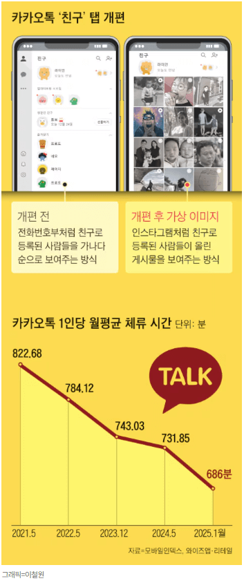 카카오톡의 가장 큰 변화 중 하나가 다가옵니다. 친구 탭이 단순 목록에서 벗어나, 인스타그램처럼 사진·영상·피드가 흘러가는 방식으로 개편됩니다. 이번 변화는 메신저를 넘어 소셜 플랫폼으로의 확장을 의미하며, 사용자 경험과 광고·수익 구조에도 큰 영향을 줄 전망입니다.